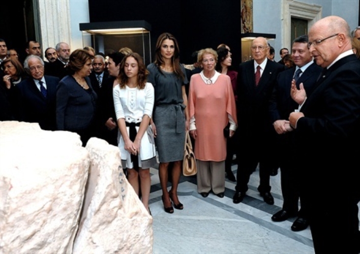 Il Presidente Giorgio Napolitano con la moglie Clio e le L.L. Maestà del Regno Hashemita di Giordania, durante la visita alla Mostra "Giordania: crocevia di popoli e di culture"