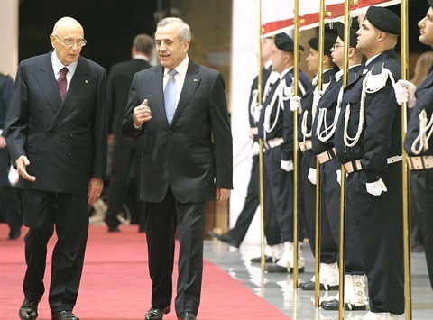 Il Presidente Giorgio Napolitano accolto al Palazzo Presidenziale di Baabda dal Presidente della Repubblica Libanese, Michel Sleiman
