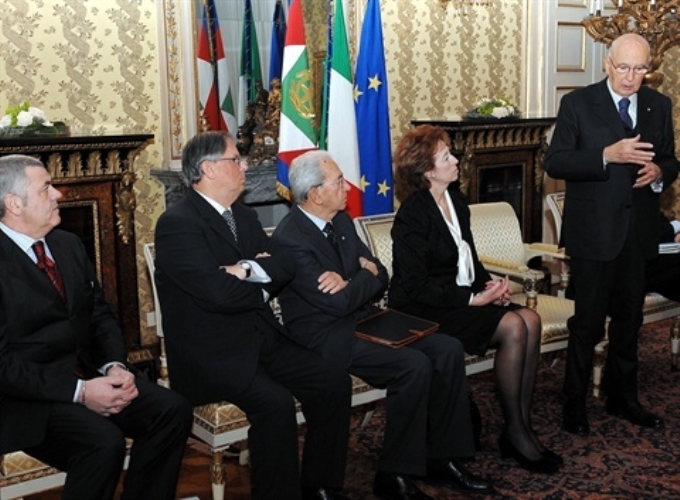 Il Presidente Giorgio Napolitano durante il suo incontro in Prefettura con i rappresentanti delle associazioni delle vittime del terrorismo