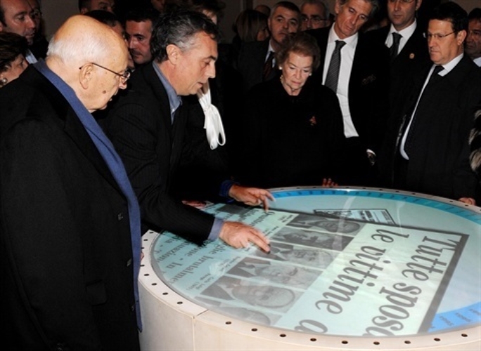 Il Presidente Giorgio Napolitano con la Signora Clio osserva il plastico della Casa della Memoria