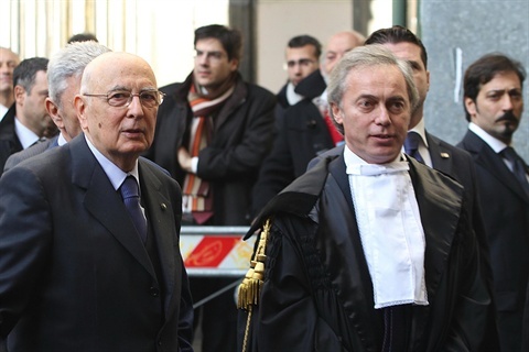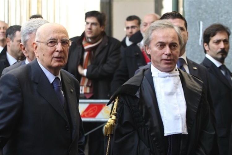 Il Presidente Giorgio Napolitano con Francesco Caia, Presidente del Consiglio dell'Ordine degli avvocati di Napoli, in occasione della cerimonia di commemorazione per il 50° anniversario della scomparsa di Enrico De Nicola