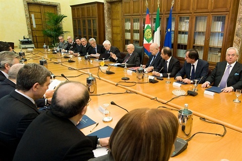 Il Presidente Giorgio Napolitano durante l'incontro in Prefettura con i vertici della Magistratura delle Forze dell'Ordine regionali, i rappresentanti delle istituzioni locali, delle Associazioni "Libera" Riferimenti" e "Omnia" e delle organizzasioni sindacali provinciali