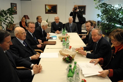 Il Presidente Giorgio Napolitano con il Ministro degli Esteri Franco Frattini nel corso dell'incontro con il Presidente del Comitato Economico e Sociale Europeo Mario Sepi e il Presidente del Comitato delle Regioni Mercedes Bresso