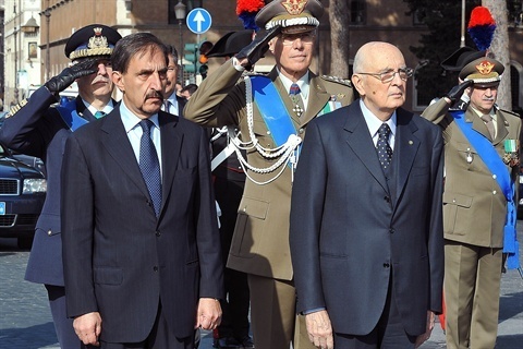Il Presidente Giorgio Napolitano nel corso della deposizione di una corona d'alloro all'Altare della Patria, in occasione del 65° anniversario della Liberazione
