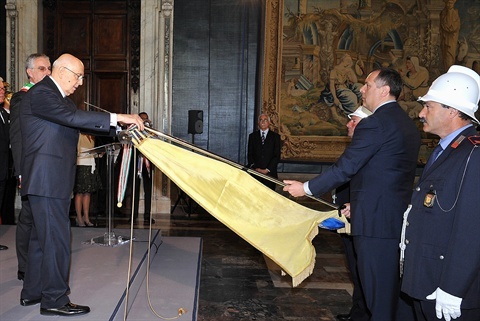 Il Presidente Giorgio Napolitano consegna la Medaglia d'Oro al Merito Civile al Comune di Sasso Marconi in occasione del 65° anniversario della Liberazione.