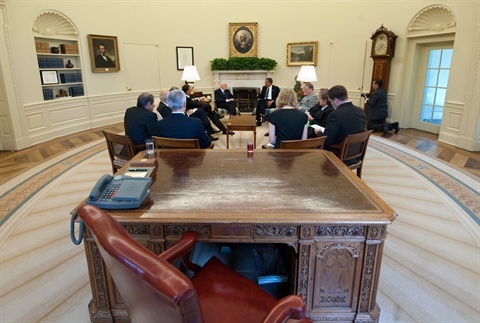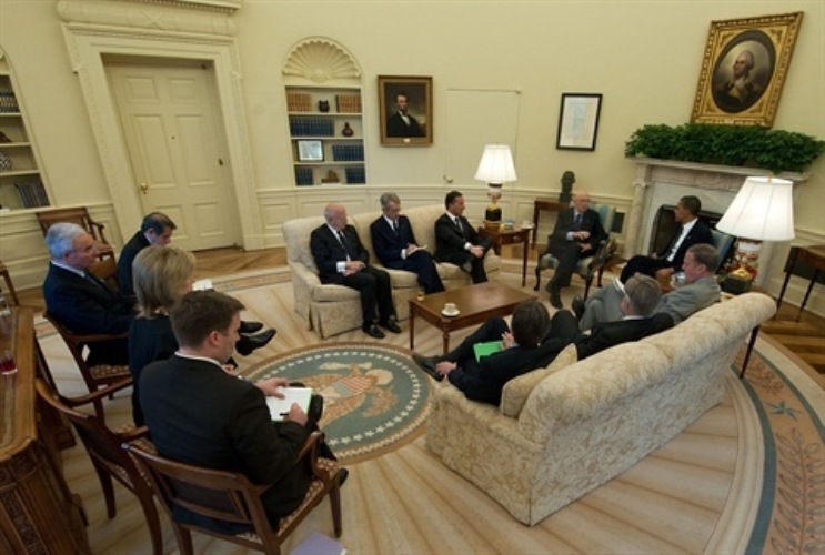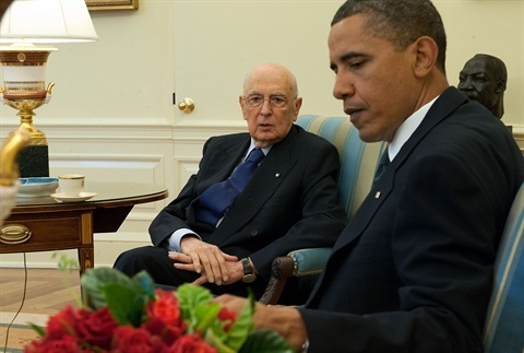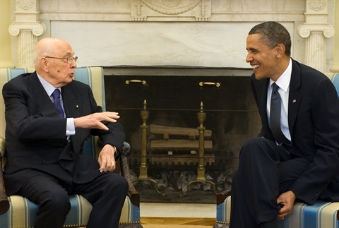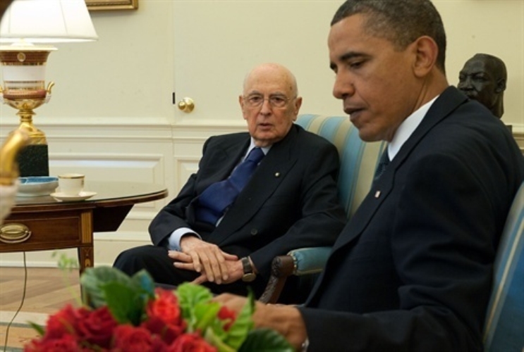 Il Presidente Giorgio Napolitano durante i colloqui con il Presidente degli Stati Uniti d'America Barack Obama nello Studio Ovale della Casa Bianca