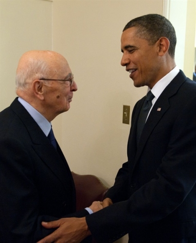 Il Presidente della Repubblica Giorgio Napolitano accolto nello Studio Ovale della Casa Bianca dal Presidente degli Stati Uniti d'America Barack Obama