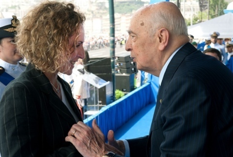 Il Presidente Giorgio Napolitano con la campionessa olimpica Alessandra Sensini, insignita della Medaglia d'Oro al Merito della Marina, in occasione della Festa della Marina Militare