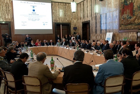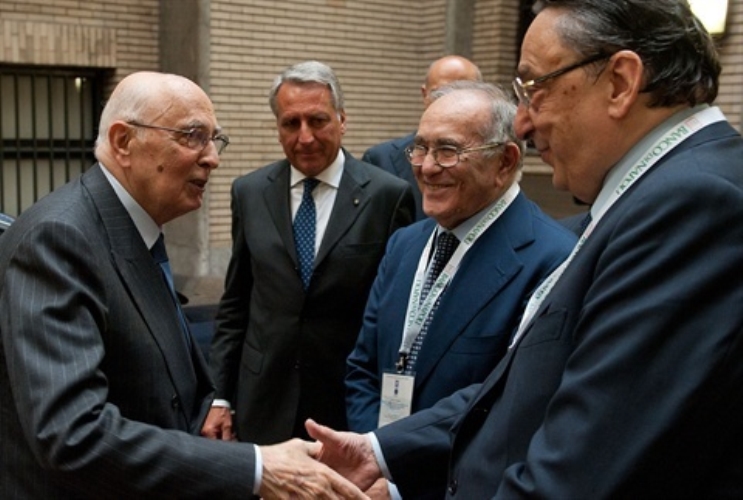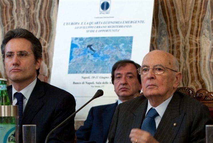 Il Presidente Giorgio Napolitano, con a fianco il Presidente della Regione Campania Stefano Caldoro, nel corso dell'intervento al convegno internazionale promosso dall'IPALMO, presso la Sede del Banco di Napoli