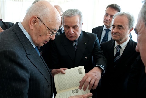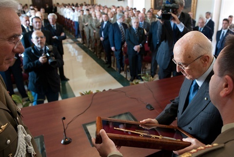 Il Presidente Giorgio Napolitano riceve lo "Spadino" simbolo della Scuola Militare "La Nunziatella", al termine dell'incontro con una rappresentanza di Cadetti