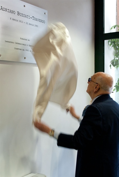 Il Presidente Giorgio Napolitano scopre una targa in ricordo del Prof. Adriano Buzzati-Traverso, fondatore del laboratorio internazionale di genetica e biofisica, al termine della cerimonia commemorativa presso l'Area di Ricerca del C.N.R.