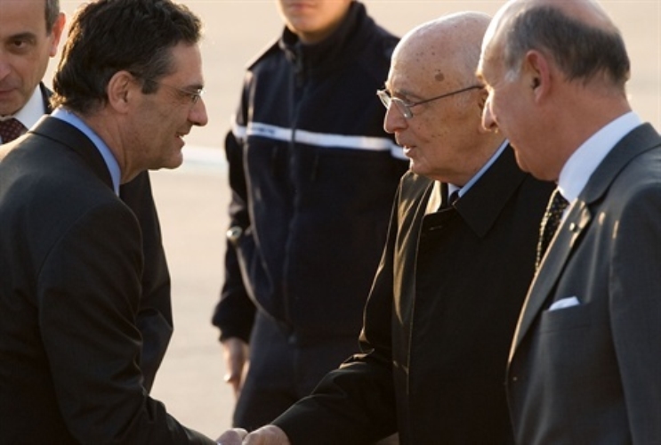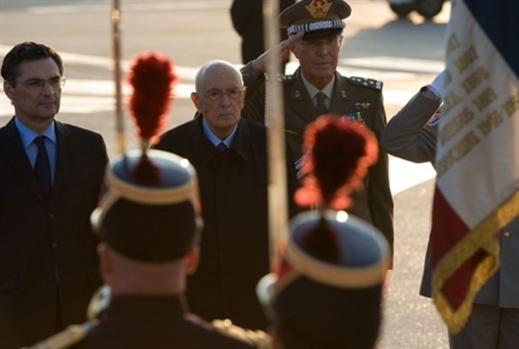 Il Presidente Giorgio Napolitano accolto al suo arrivo a Parigi dal Ministro francese per l'attuazione del piano di rilancio economico, Patrick Devedjan