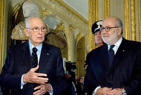 Il Presidente Giorgio Napolitano con a fianco l'Ambasciatore Giovanni Caracciolo di Vietri, in occasione dell'incontro presso l'Ambasciata d'Italia a Parigi