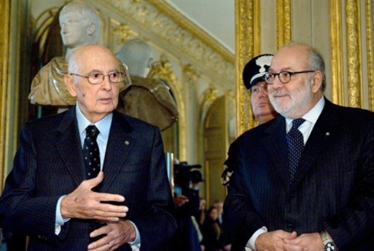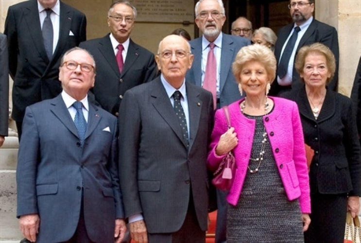 Il Presidente Giorgio Napolitano con a fianco il Cancelliere dell'Istitut de France Gabriel de Broglie, in occasione della visita all'Istituto