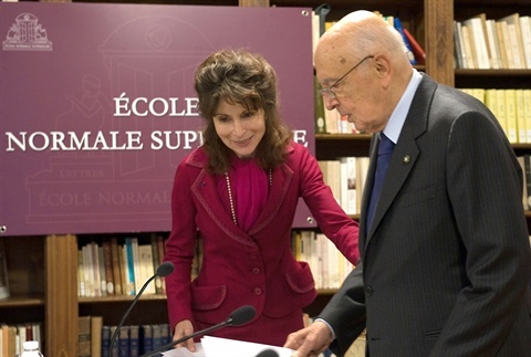 Il Presidente Giorgio Napolitano con la Direttrice dell'Ecole Normale Supérieure Monique Canto-Sperber, poco prima del suo intervento in occasione del convegno italo-francese su "Cavour l'europeo e la rivoluzione diplomatica" presso l'Ecole Normale