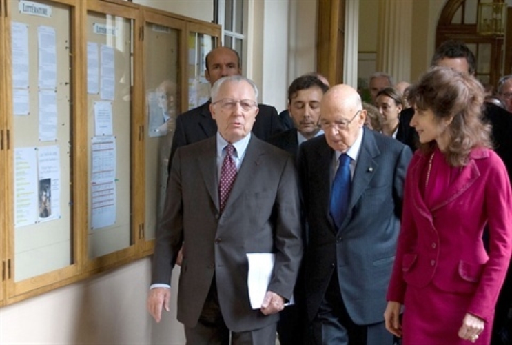 Il Presidente Giorgio Napolitano al suo arrivo all'Ecole Normale Supérieure, accompagnato da (sinistra) Jacques Delors, Gilles Pécout e dalla Direttrice della Scuola Monique Canto-Sperber, in occasione del convegno italo-francese su "Cavour l'europeo e la rivoluzione diplomatica" presso l'Ecole Normale Supérieure