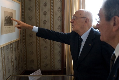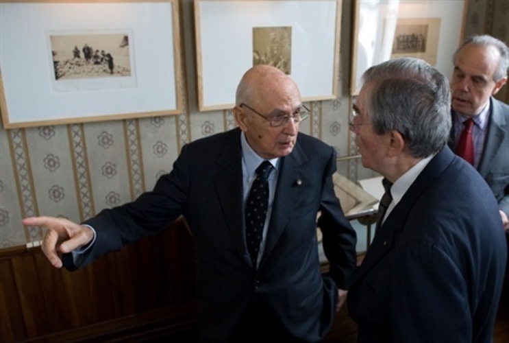 Il Presidente Giorgio Napolitano osserva una delle rare fotografie che ritraggono Camillo Benso conte di Cavour, nel corso della visita al Museo Nissim de Camondo, in occasione della mostra "La France et le Risorgimento, Cavour et Napoléon III: deux grands réalisateurs de l'unification italienne"