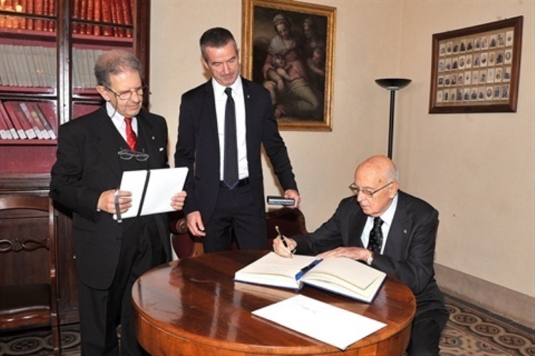 Il Presidente Giorgio Napolitano durante la firma dell'Albo d'onore dell'Ateneo in occasione del bicentenario della fondazione della Scuola Normale Superiore