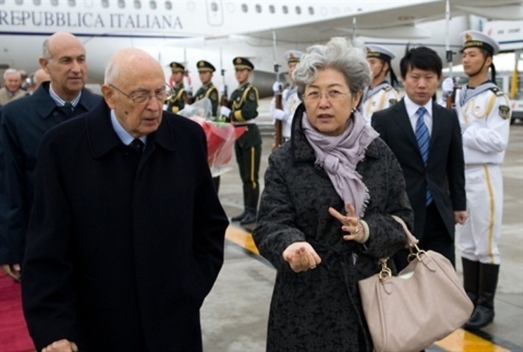 Il Presidente Giorgio Napolitano al suo arrivo a Pechino, in occasione della visita di Stato, accolto dal Vice Ministro degli Affari Esteri Fu Ying