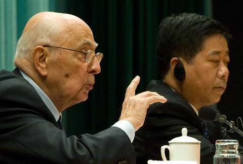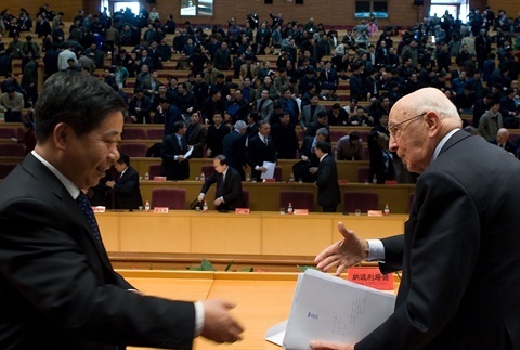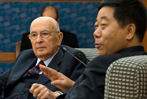 Il Presidente Giorgio Napolitano, con a fianco il Vice Presidente della Scuola Centrale del Partito Comunista cinese Chen Baosheng, nel corso dell'incontro con i componenti della scuola