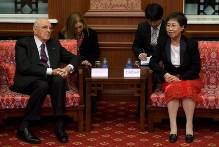 Il Presidente Giorgio Napolitano e il Vice Presidente dell'Assemblea Nazionale del Popolo Signora Uyunqing scoprono due buste emesse in occasione delle celebrazioni della Visita di Stato in Cina e del quarantennale delle relazioni diplomatiche tra la Cina e l'Italia