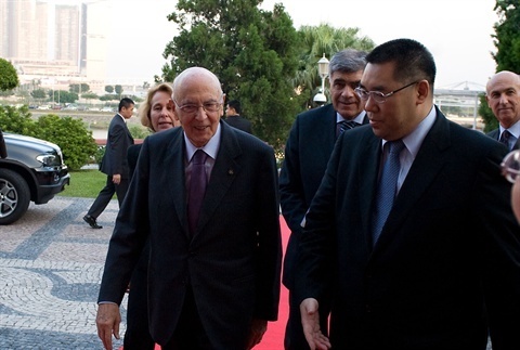 Il Presidente della Repubblica Giorgio Napolitano accolto alla Government House dal Chief Executive di Macao, Fernando Chui Sai-On