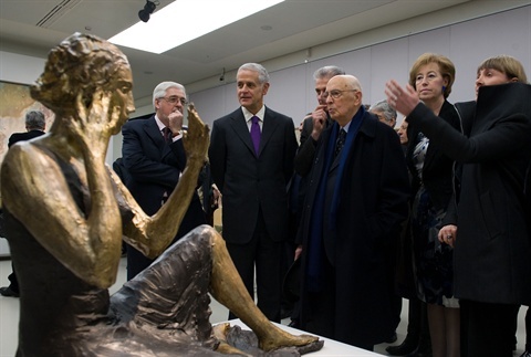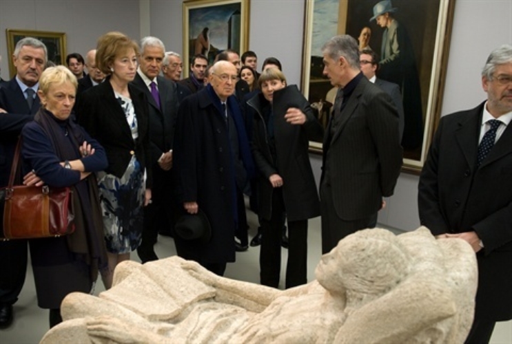 Il Presidente Giorgio Napolitano, con a fianco il Presidente della Regione Lombardia Roberto Formigoni e il Sindaco di Milano Letizia Moratte, nel corso della visita al Museo del Novecento, illustrata dalla Direttrice del Polo del Novecento ed Arte Contemporanea Marina Pugliese