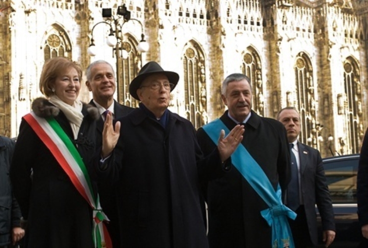 Il Presidente Giorgio Napolitano al suo arrivo al Museo del Novecento, accolto dal Sindaco di Milano Letizia Moratti, dal Presidente della Regione Roberto Formigoni e dal Presidente della Provincia Guido Podestà