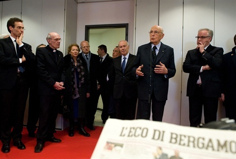 Il Presidente Giorgio Napolitano nel corso dell'incontro con una rappresentanza dei redattori e del personale tecnico-amministrativo del quotidiano "L'Eco di Bergamo"