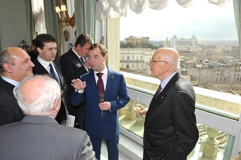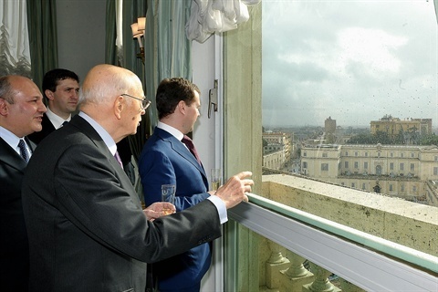 Il Presidente Giorgio Napolitano con Dmitrij Medvedev mentre guardano Roma dal Torrino del Quirinale