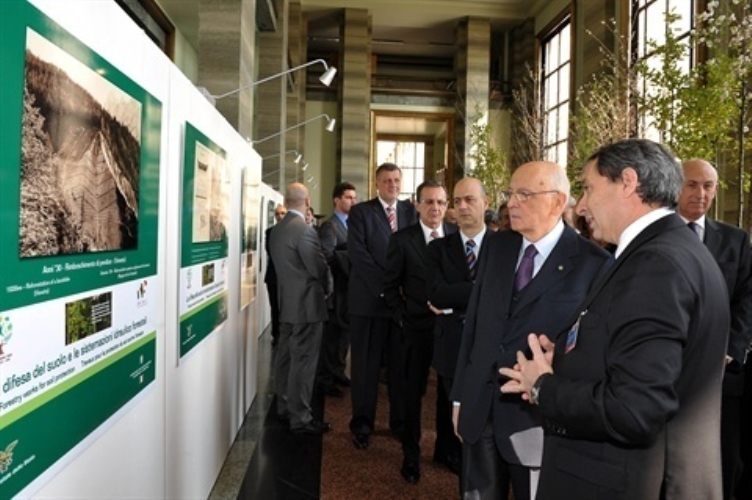 Il Presidente Giorgio Napolitano con Cesare Patrone, Capo del Corpo Forestale durante la visita alla Mostra fotografica "L'annèe internazionale des forets: exposition de photos et arbres"