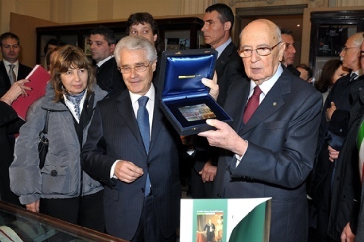 Il Presidente Giorgio Napolitano con il Dott. Giovanni Ialongo, Presidente delle Poste Italiane , durante lo speciale annullo filatelico dedicato ai 150 anni dell'Unità d'Italia