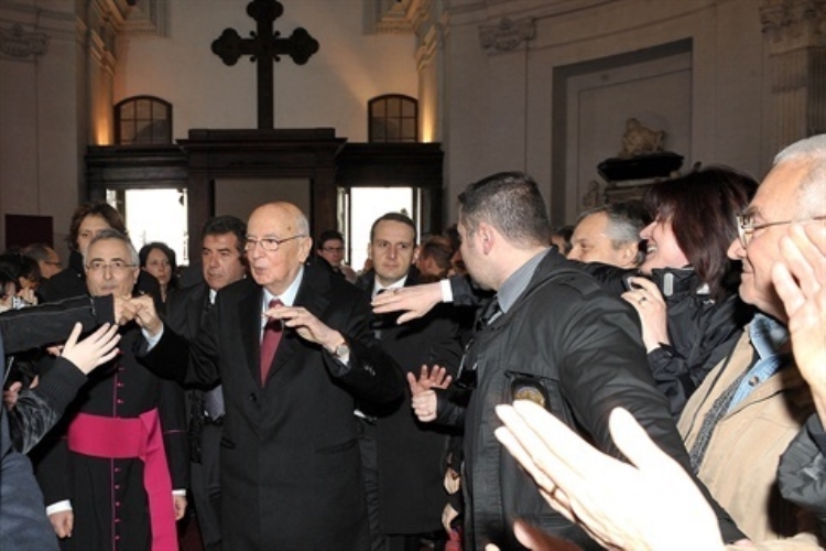 Il Presidente Giorgio Napolitano al suo arrivo alla Basilica di Santa Maria degli Angeli e dei Martiri in occasione della celebrazione eucaristica officiata dal Presidente della CEI, S.Em. Rev.ma il Cardinale Angelo Bagnasco per il 150° Anniversario dell'Unità d'Italia
