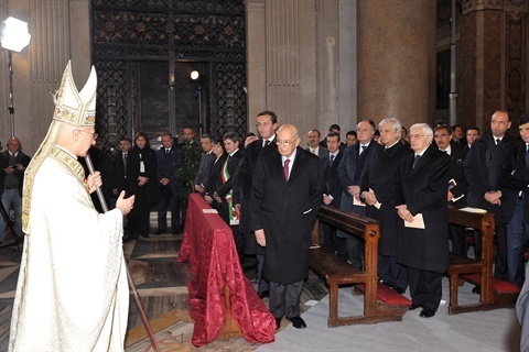 Il Presidente Giorgio Napolitano nella Basilica di Santa Maria degli Angeli e dei Martiri in occasione della celebrazione eucaristica officiata dal Presidente della CEI S.Em. Rev.ma il Cardinale Angelo Bagnasco per il 150° Anniversario dell'Unità d'Italia