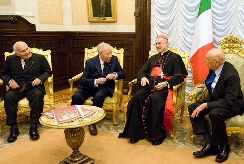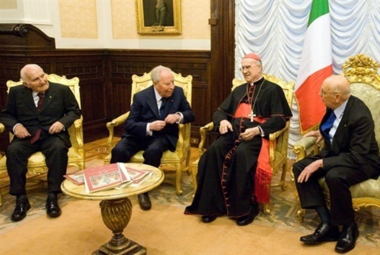 Il Presidente Giorgio Napolitano con i Presidenti Emeriti della Repubblica Oscar Luigi Scàlfaro e Carlo Azeglio Ciampi e il Segretario di Stato della Santa Sede S.E. Rev.ma il Card. Tarcisio Bertone, poco prima della cerimonia celebrativa del 150° dell'Unità d'Italia a Palazzo Montecitorio