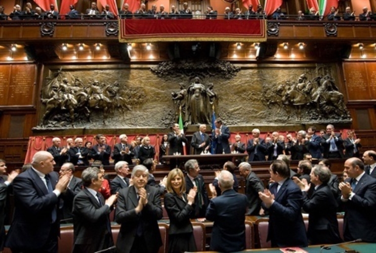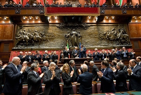 Il Presidente Giorgio Napolitano al termine del suo intervento in occasione della cerimonia celebrativa del 150° dell'Unità d'Italia a Palazzo Montecitorio