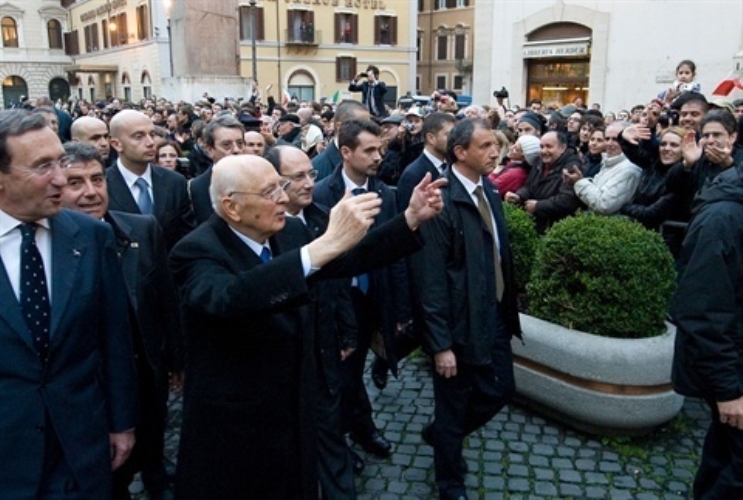 Il Presidente Giorgio Napolitano risponde al saluto dei molti cittadini che affollavano Piazza Montecitorio