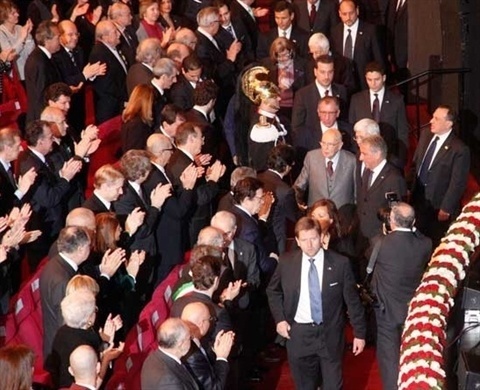 Il Presidente Giorgio Napolitano durante l'esecuzione dell'Inno Nazionale al Teatro Regio