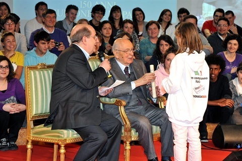 Il Presidente Giorgio Napolitano con il Sig. Ernesto Olivero, Fondatore del Sermig, in occasione della cerimonia di consegna del Premio"Artigiano della Pace 2011"