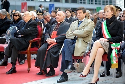 Il Presidente Giorgio Napolitano saluta l'Arcivescovo di Milano S.E. Rev.ma Card. Dionigi Tettamanzi, in occasione dell'inaugurazione della nuova sede della Regione Lombardia