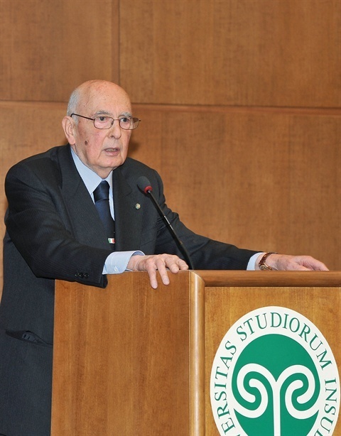 Il Presidente della Repubblica Giorgio Napolitano nel corso del suo intervento all'Università dell'Insubria