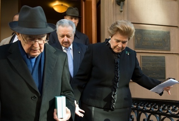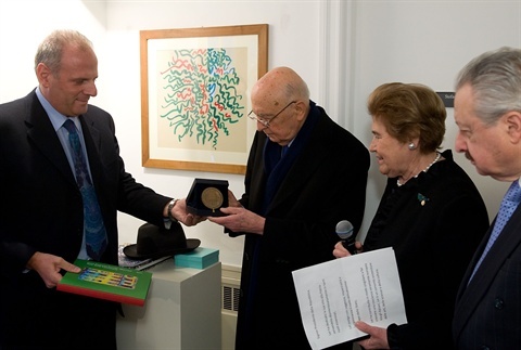 Il Presidente Giorgio Napolitano riceve da Stefano Albertini e dalla Baronessa Mariuccia Zerilli Marimò una medaglia ricordo per la ricorrenza del ventesimo anniversario di fondazione della "Casa Italiana Zerilli Marimò"