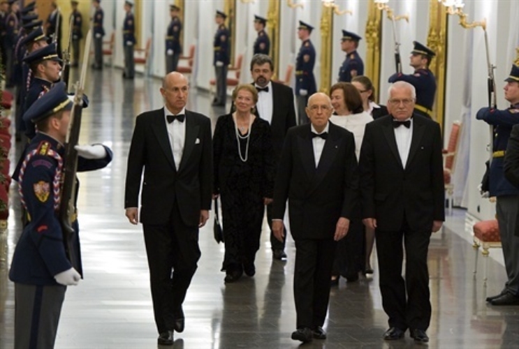 Il Presidente Giorgio Napolitano con il Presidente della Repubblica Ceca Vaclav Klaus e le rispettive consorti al Castello di Praga, in occasione del Pranzo di Stato