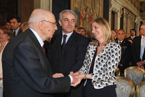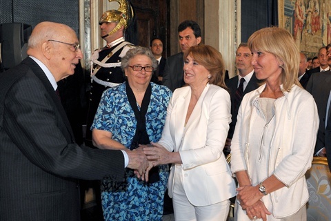 Il Presidente Giorgio Napolitano saluta Carmelina Di Roma, sorella di Ciriaco Di Roma, in occasione della cerimonia del Giorno della Memoria dedicato alle vittime del terrorismo