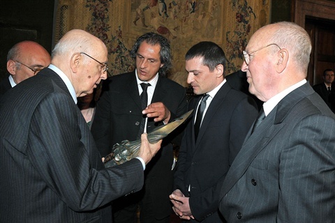 Il Presidente Giorgio Napolitano riceve la stele realizzata da Antonio di Campli in onore del magistrato Mario Amato.