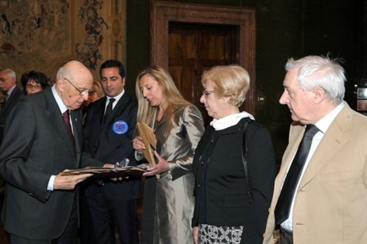 Il Presidente Giorgio Napolitano riceve il volume "Divise Forate" nel corso della cerimonia del Giorno della Memoria dedicato alle vittime del Terrorismo