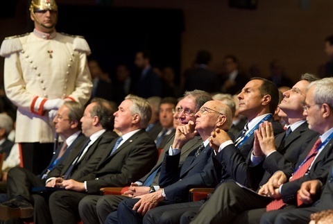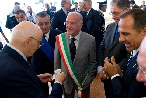 Il Presidente Giorgio Napolitano con il Presidente della Provincia di Napoli Luigi Cesaro, il Sindaco di Pozzuoli Agostino Magliulo, l'On. Rocco Buttiglione e il Presidente dell'Unione Industriali di Napoli Paolo Graziano, poco prima dell'intervento all'Assemblea pubblica dell'Unione Industriali di Napoli