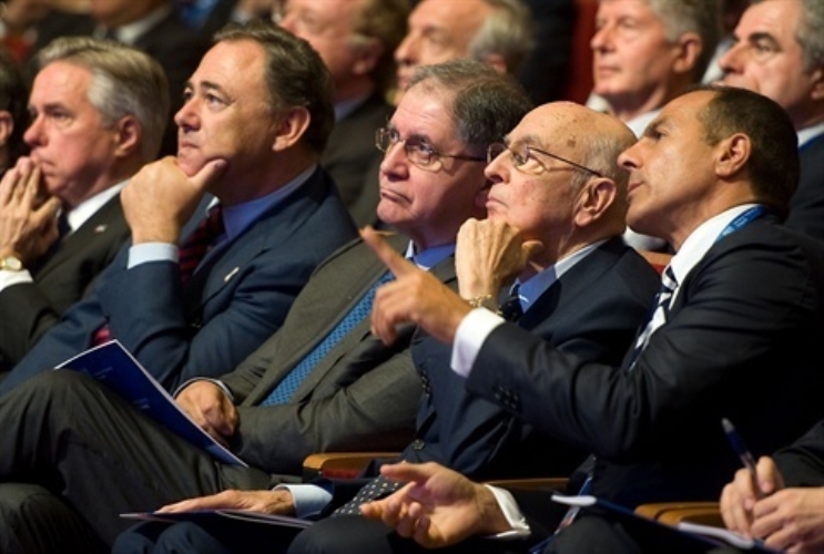 Il Presidente Giorgio Napolitano con a fianco l'On. Rocco Buttiglione (a sinistra) e il Presidente dell'Unione Industriali di Napoli Paolo Graziano, nel corso dell'Assemblea pubblica del'Unione Industriali di Napoli