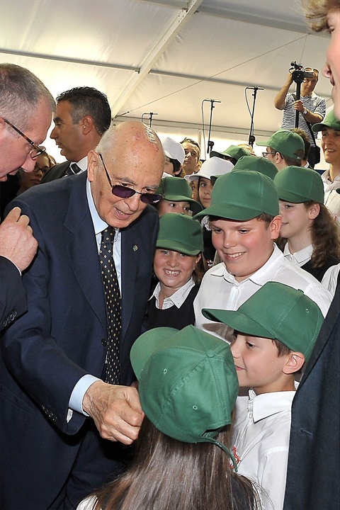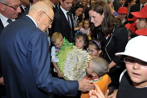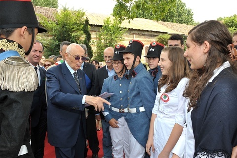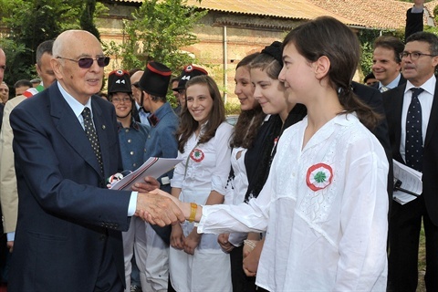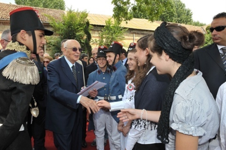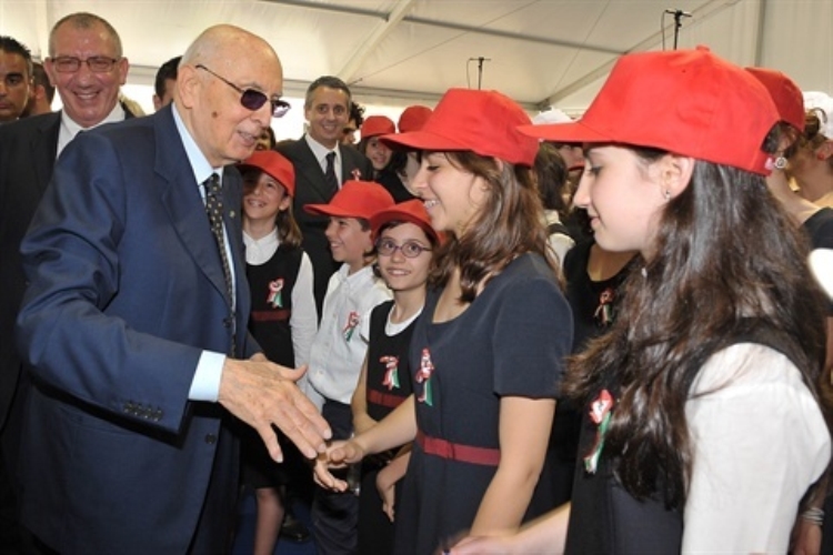 Il Presidente Giorgio Napolitano saluta i ragazzi che hanno partecipato alla rappresentazione dello spettacolo "L'alba delle libertà"