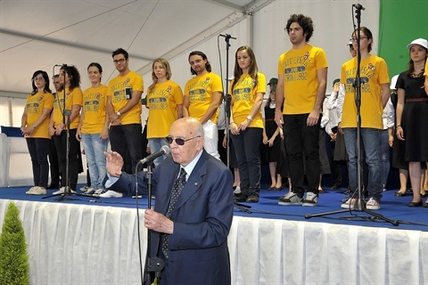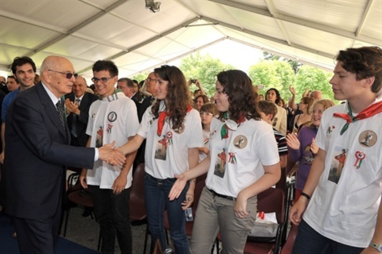 Il Presidente Giorgio Napolitano con i ragazzi della rappresentazione dello spettacolo "L'alba delle libertà", canzoni e musiche della Costituzione
